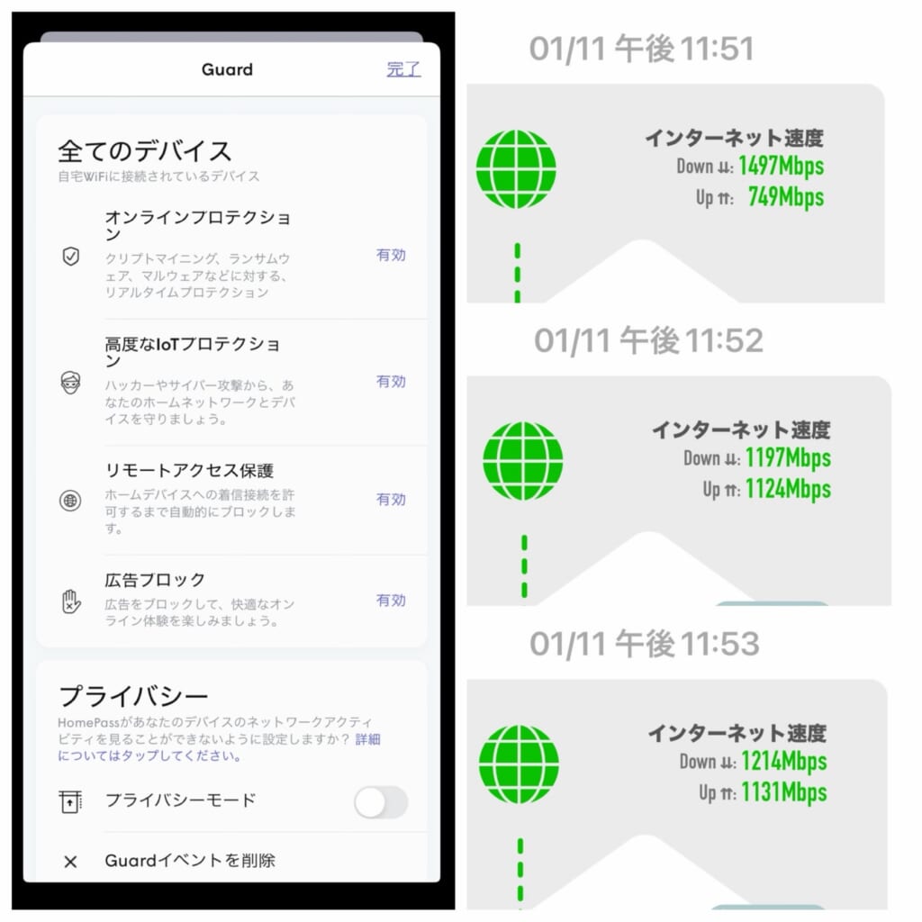 有効にして速度計測したところ、ダウンロード速度は夜間の混み合う時間帯でも安定して1Gbps以上となり、YouTubeの動画を立て続けに切り替えてもスパスパ再生されるようになりました。
