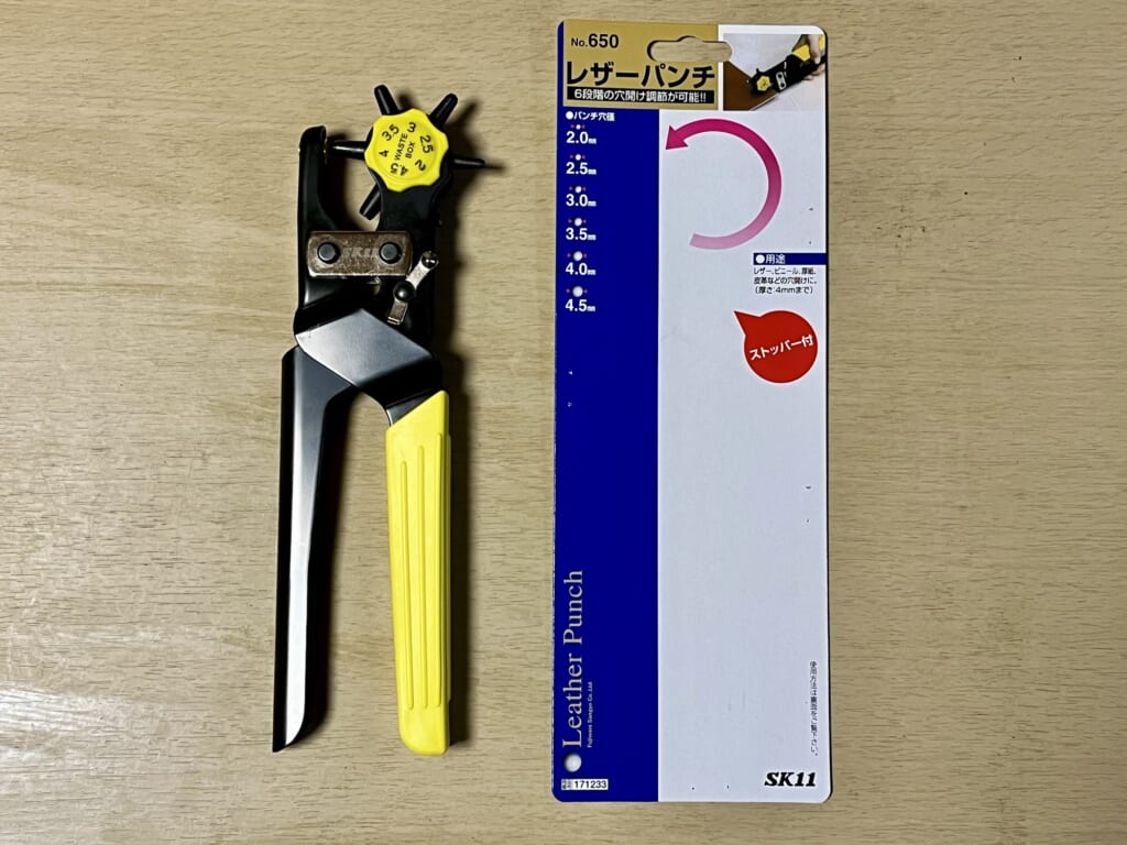 バックル固定式なのでベルトに穴を開けるしかなく、ホームセンターに出掛けて「レザーパンチ」を買ってきました。