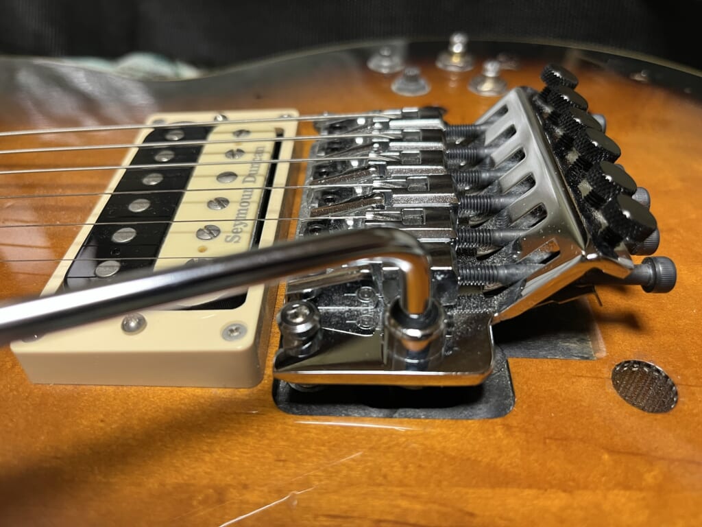 そのまま弾いていましたが、YouTubeで調べるうち。どうやらトレモロユニットのセッティングのせいではないかと考えるに至りました。